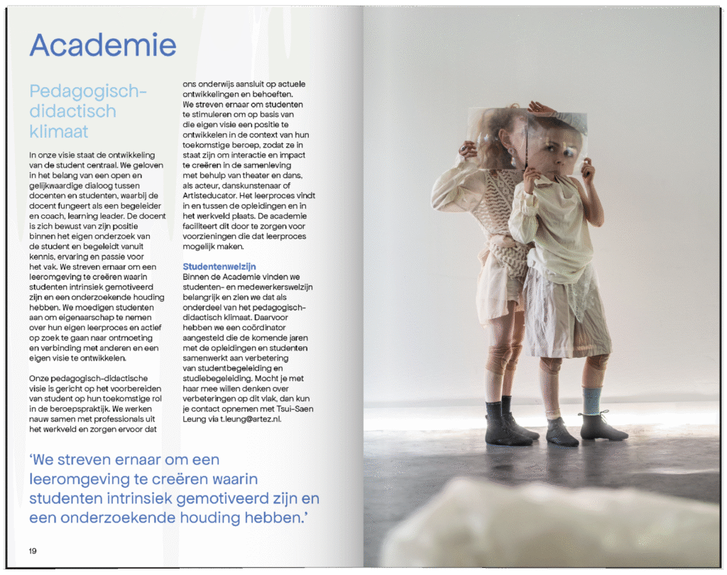 Elk jaar ontwikkelt de afdeling van Theater & Dans van ArtEZ Hogeschool voor de Kunsten Arnhem en Zwolle een studiegids voor studenten. Een fijne gids waarin zij alle informatie kunnen vinden die ze gedurende het jaar nodig kunnen hebben. Ook dit jaar mochten wij aan de slag met de studiegids voor het nieuwe schooljaar.